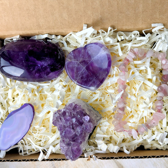 Each kit contains 4 high-quality crystals, palm stone, purple agate slice, amethyst cluster, heart shape and a bracelet.