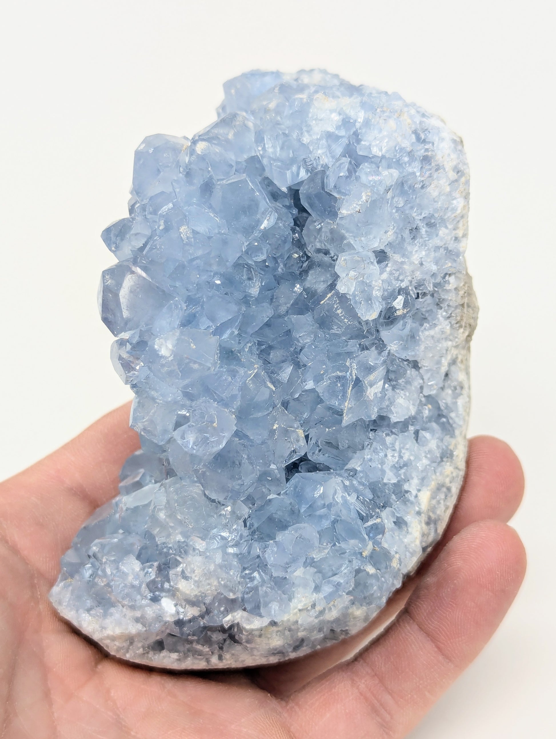 Celestite is a soft mineral (Mohs 3-3.5), so avoid prolonged exposure to direct sunlight to preserve color. Clean gently with a soft, dry cloth — do not use water or chemicals.